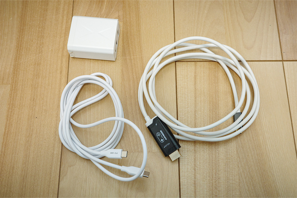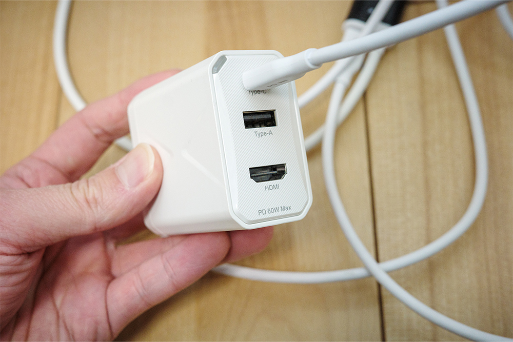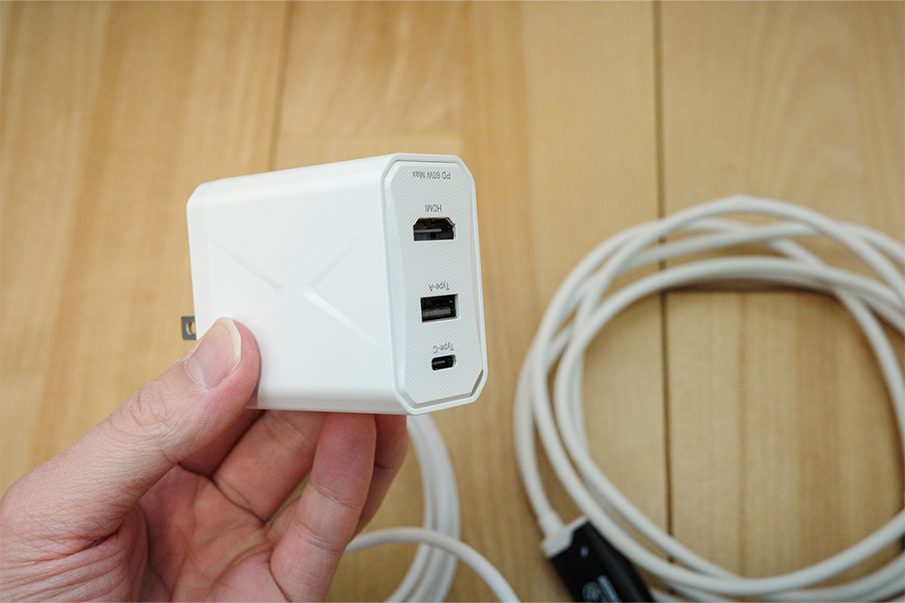 ドック + 画面出力 + バッテリー充電を同時に行うには 60 W 前後の電源が必要になります。W数が足りないと、画面に映らなかったり、充電が不十分になったりする可能性があります。