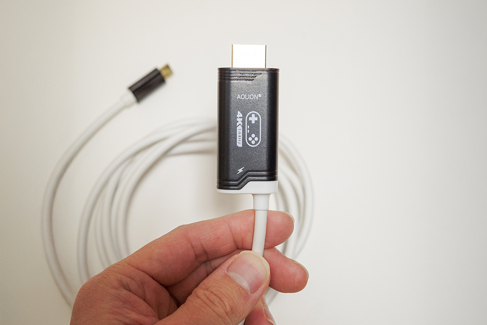 ドックケーブルとType-Cケーブルを接続し、HDMI端子をテレビに、残りのType-Cケーブルを電源アダプターに挿します。