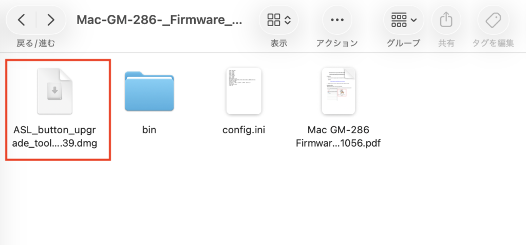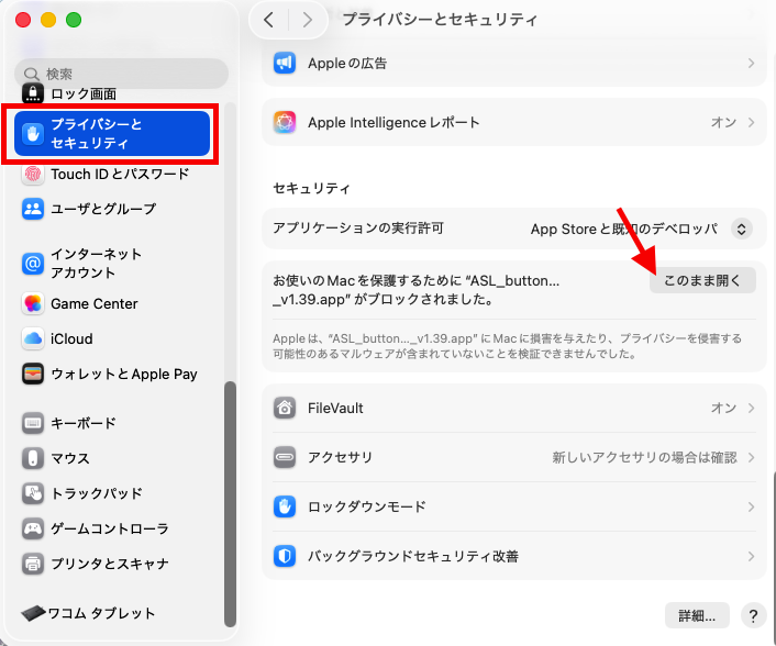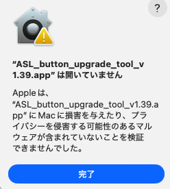 「ASL_button_upgrade_tool_v1.39.dmg」のファイルをクリックするとセキュリティの警告がでます。完了を押し、設定からプライバシーとセキュリティを下の方までスクロールするとブロックされたファイルがあるのでこのまま開くを押します。