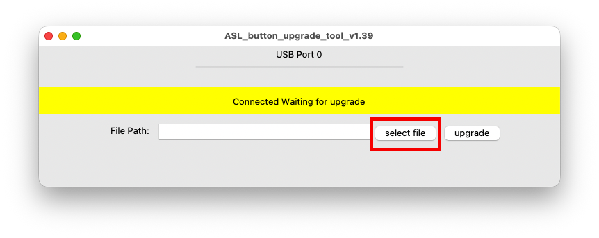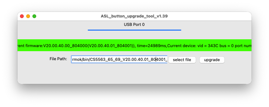バーが黄色に変わっている状態で「Select File」をクリックし、ダウンロードしたファイルの中から「CS5563_65_69_V20.00.40.01_804001_VRR.bin」を探し、開くを押します。
